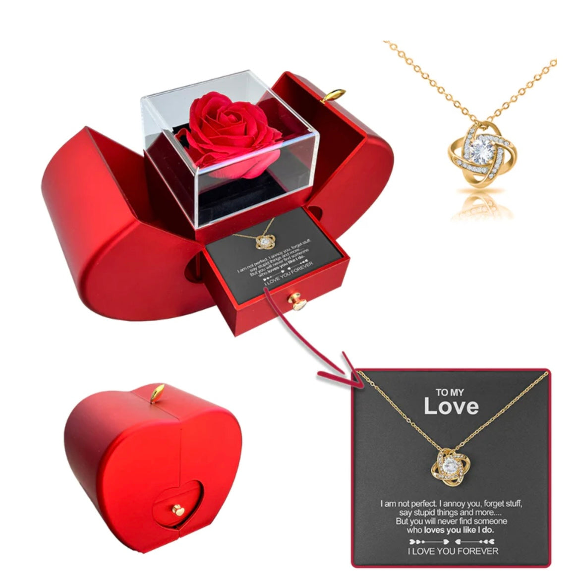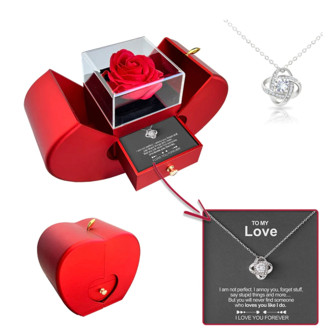 Stop struggling to find the perfect gift. The Lovebloom RoseBox™ is a complete gift set featuring a preserved rose, a stunning diamond necklace, and a personalized greeting card-your perfect way to show her how much she means to you, without overthinking it.